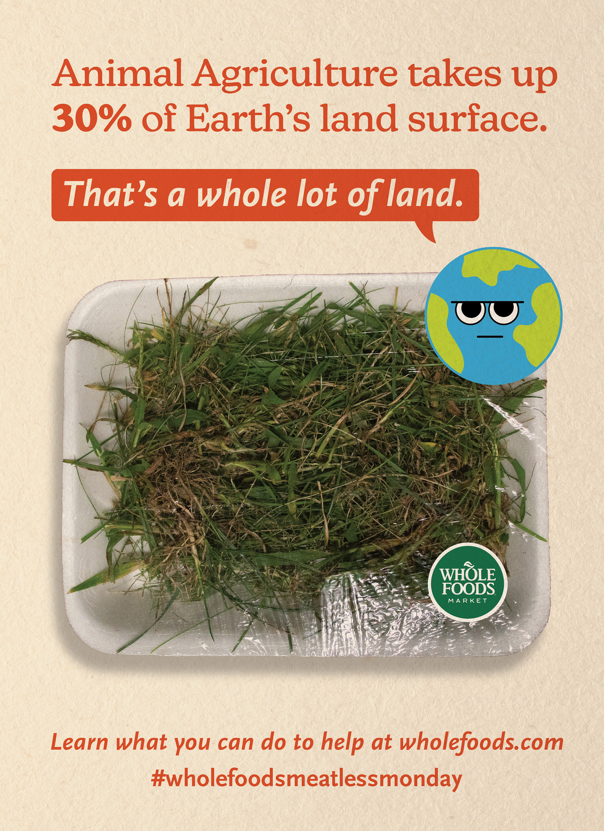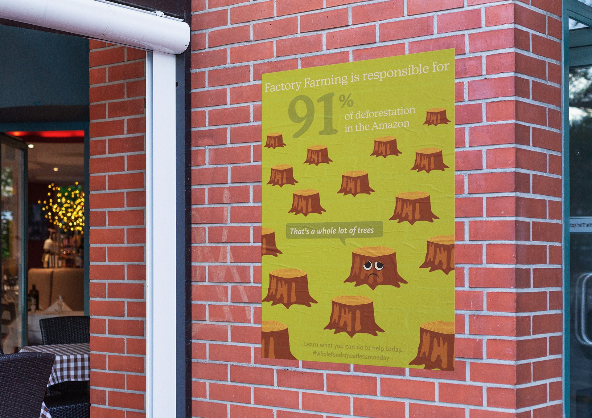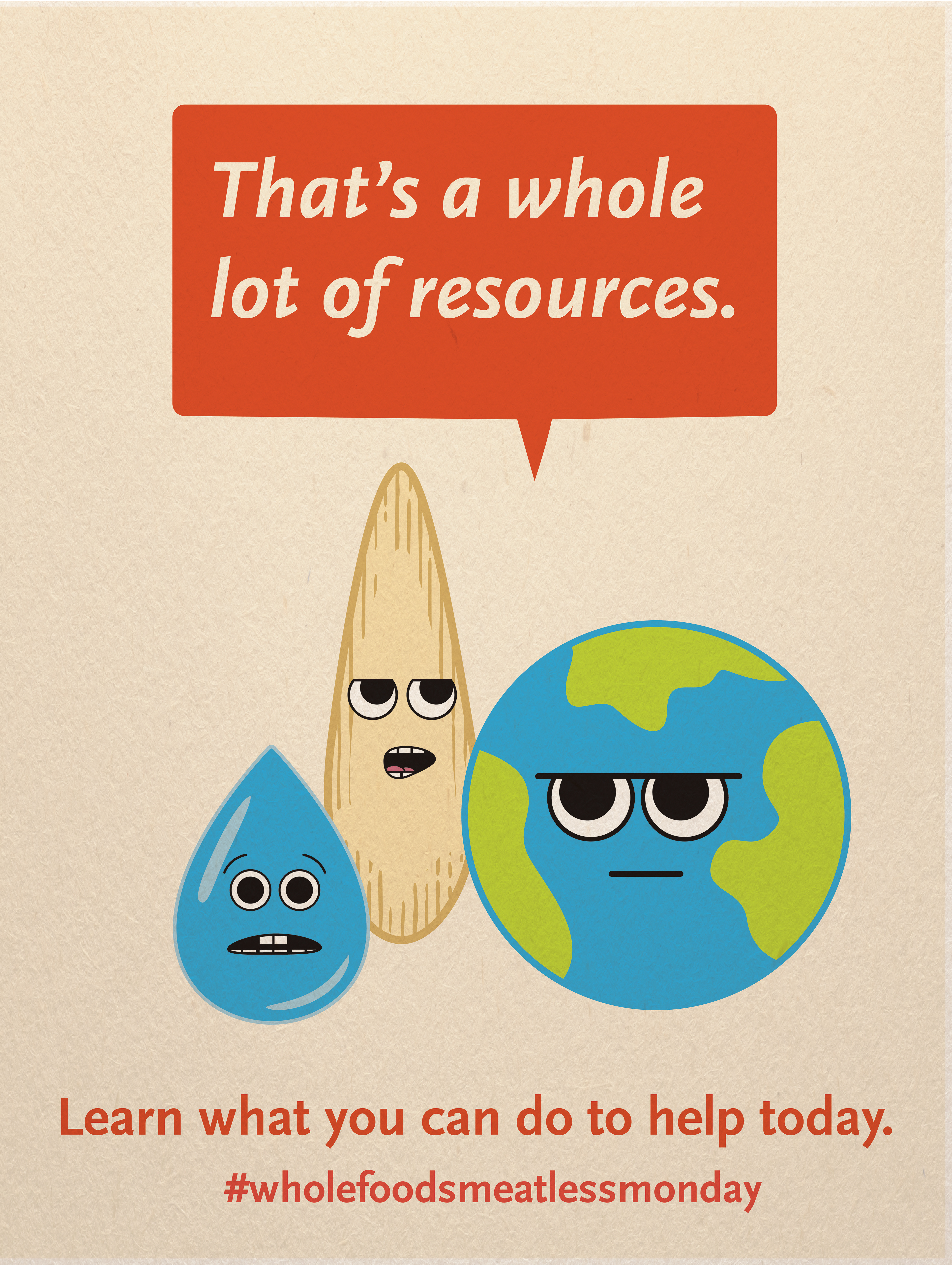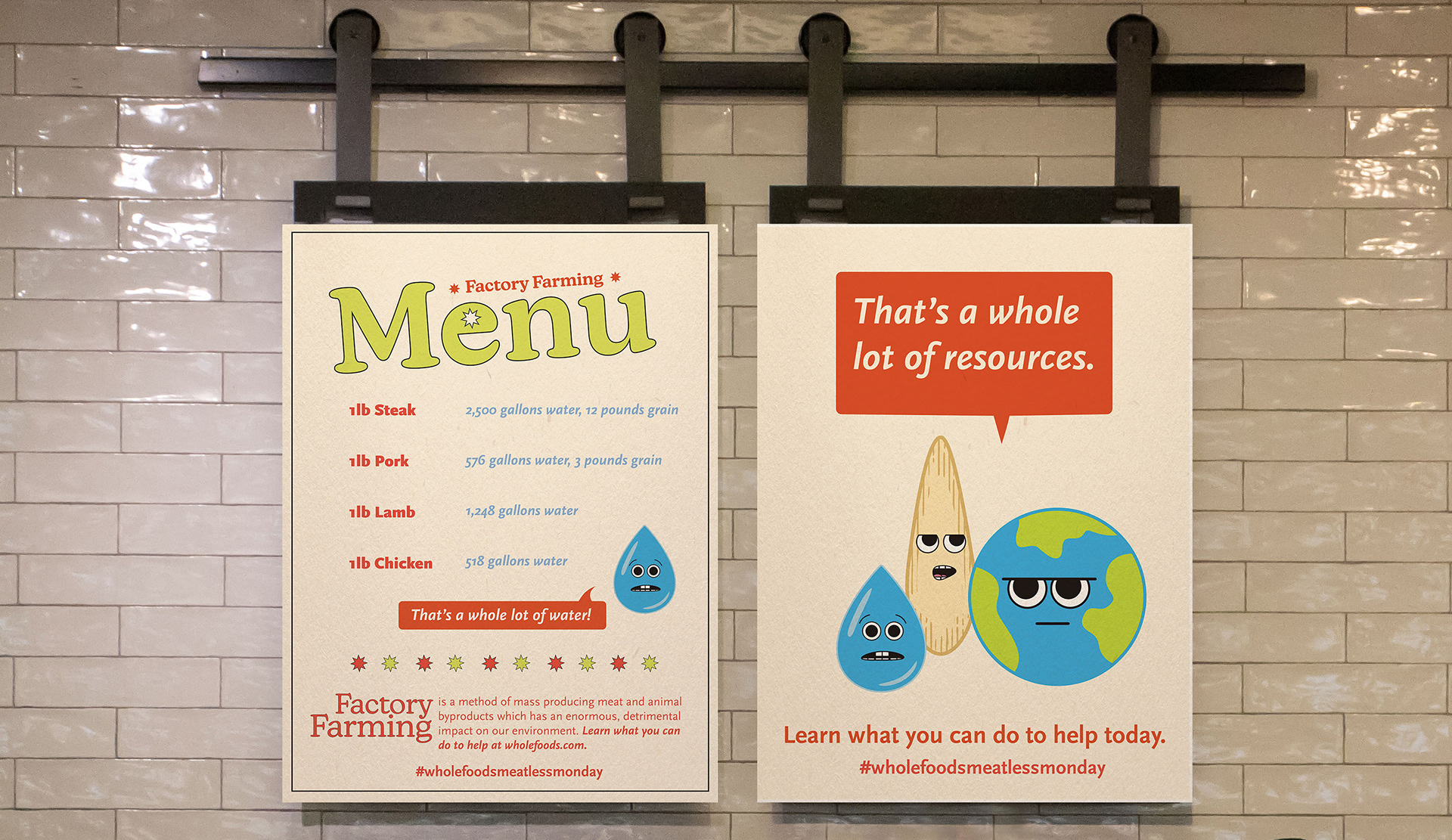 Factory Farming has a significant impact on the Earth’s resources, and one way we can combat the effects is to eat less meat. For this campaign, every Monday the popular grocer Whole Foods will take their meat products off the shelves to help reduce greenhouse emissions. This campaign not only gives an insight into the problems of factory farming but also gives people a way to contribute to decreasing the resources we use. Characters representing the impacts of factory farming were utilized in order to address the audience in a non-threatening manner.