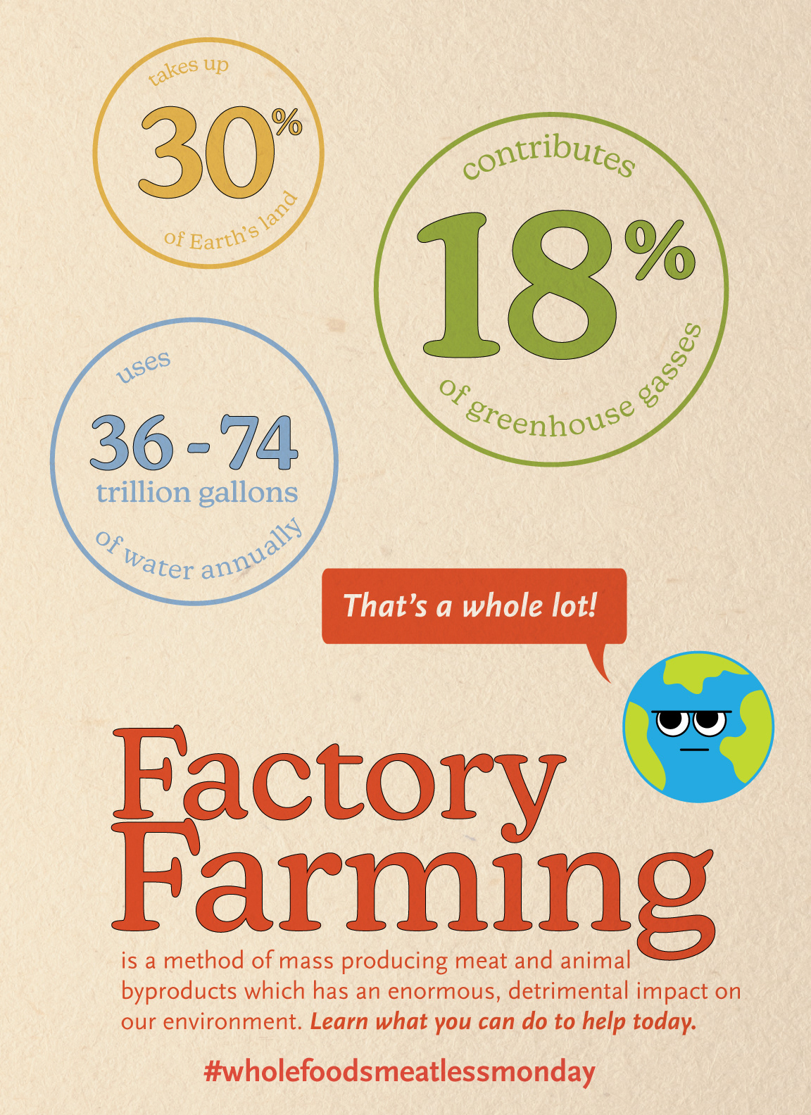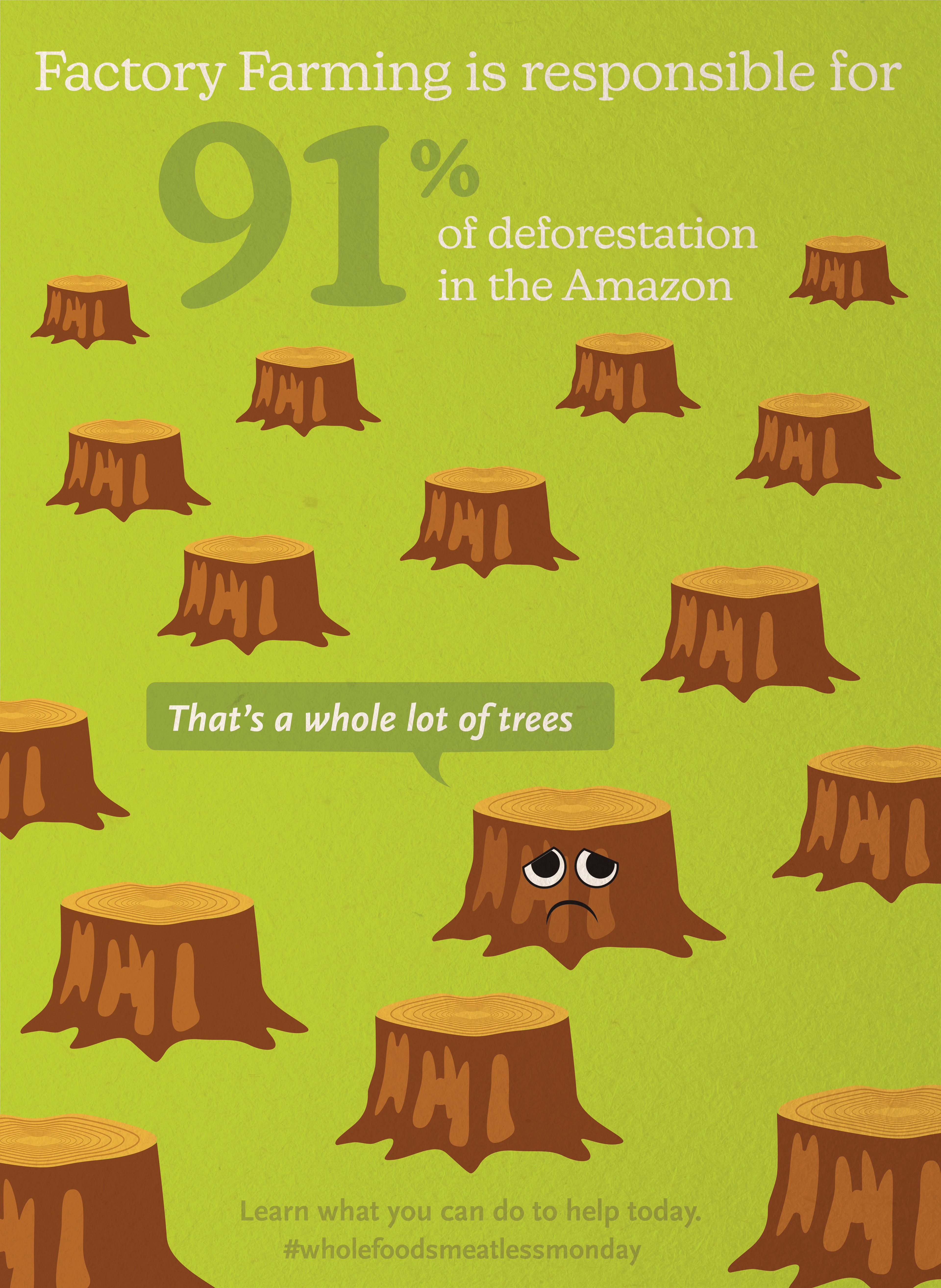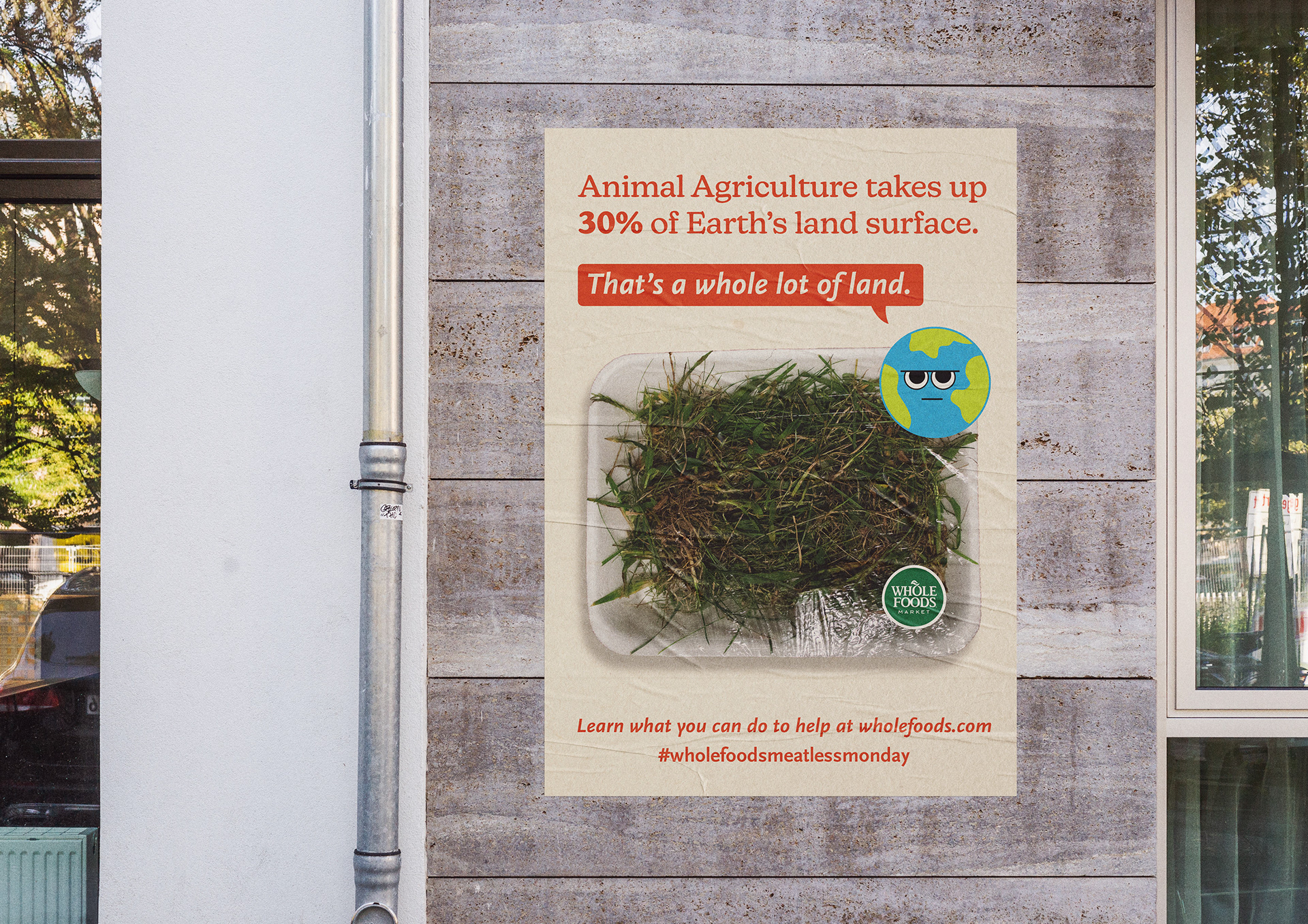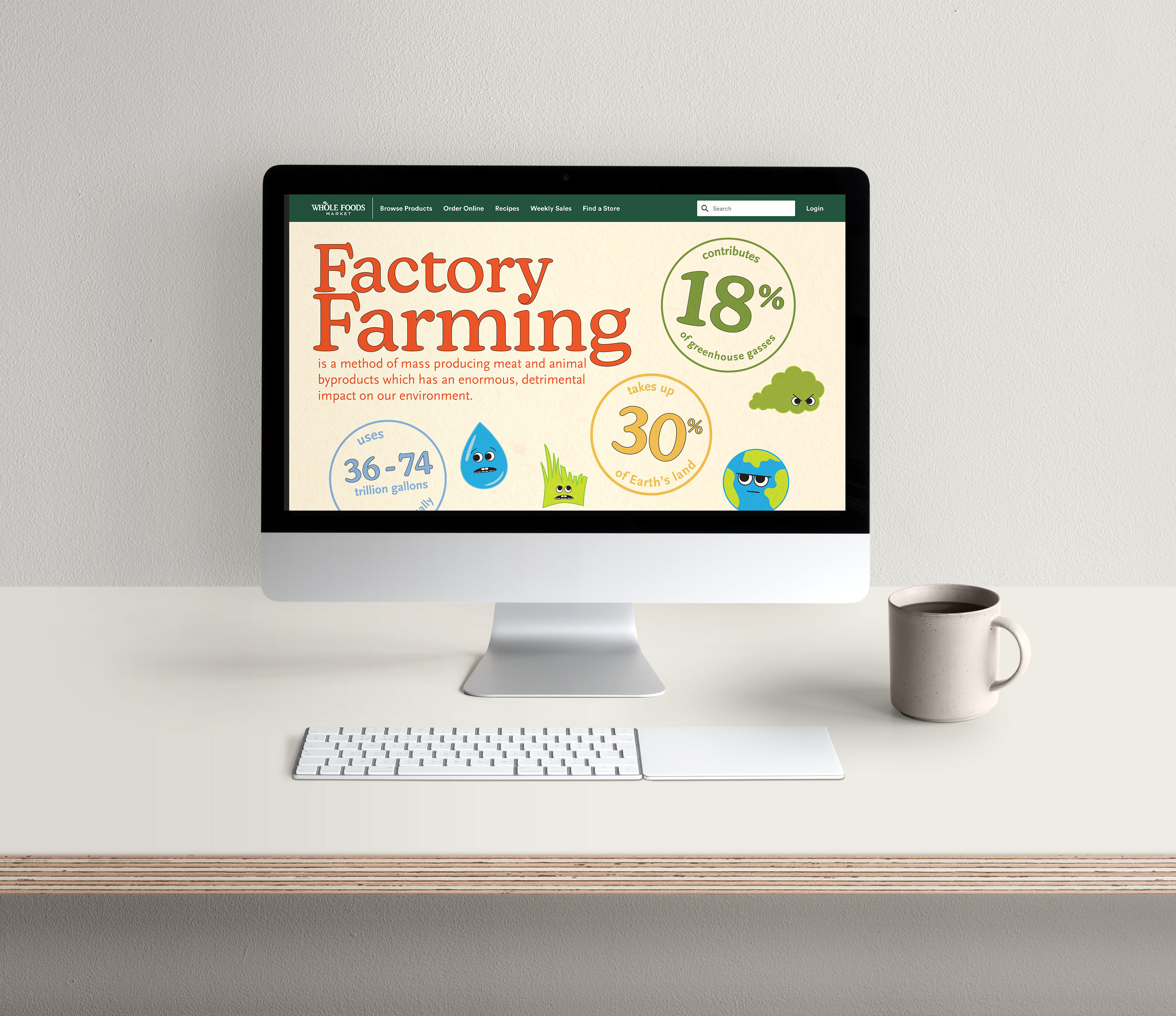 Factory Farming has a significant impact on the Earth’s resources, and one way we can combat the effects is to eat less meat. For this campaign, every Monday the popular grocer Whole Foods will take their meat products off the shelves to help reduce greenhouse emissions. This campaign not only gives an insight into the problems of factory farming but also gives people a way to contribute to decreasing the resources we use. Characters representing the impacts of factory farming were utilized in order to address the audience in a non-threatening manner.