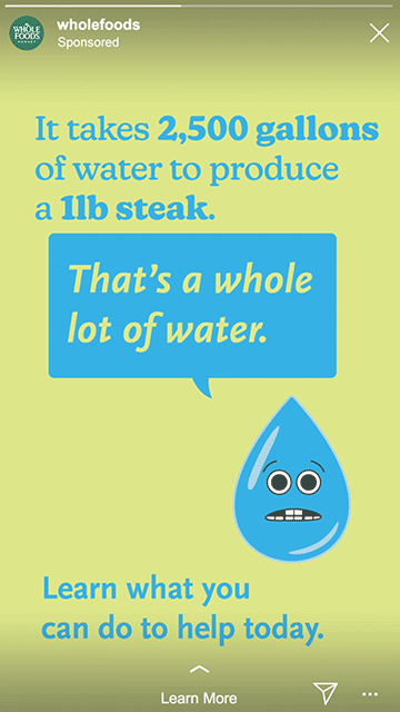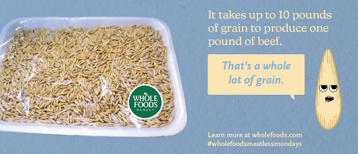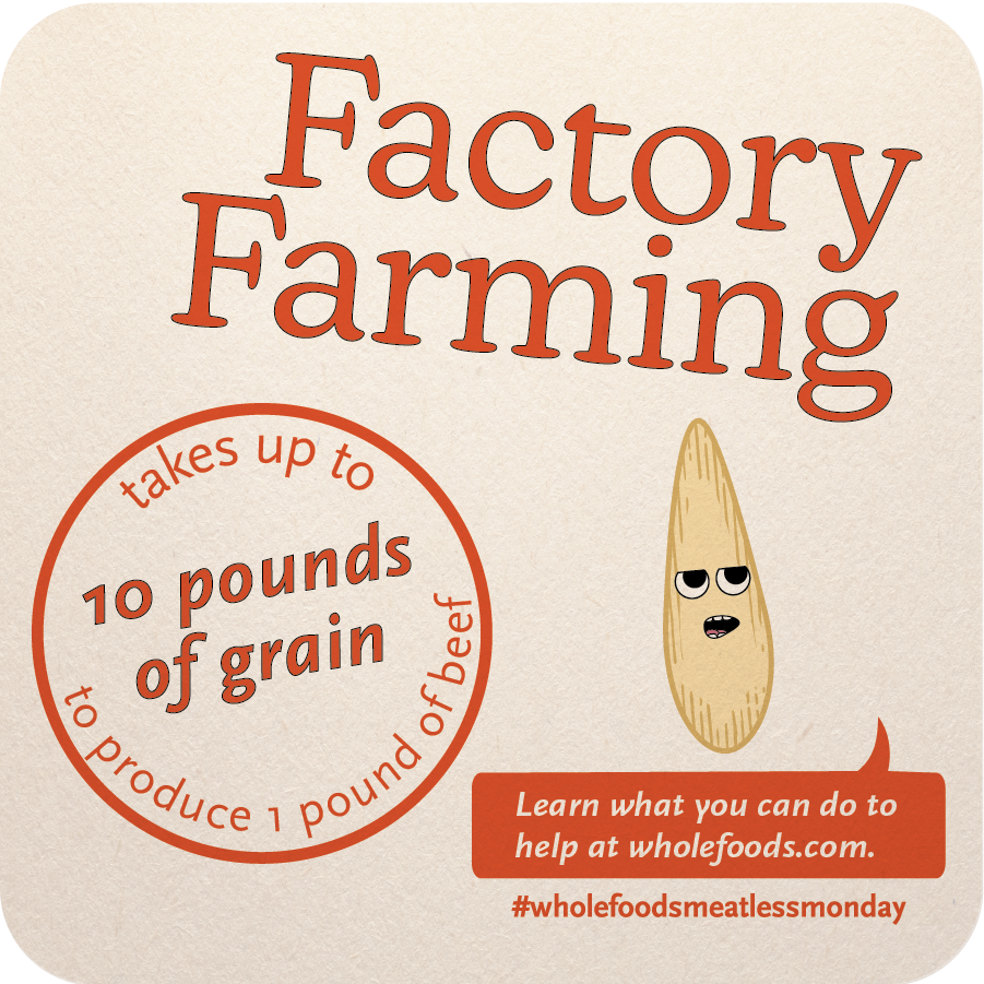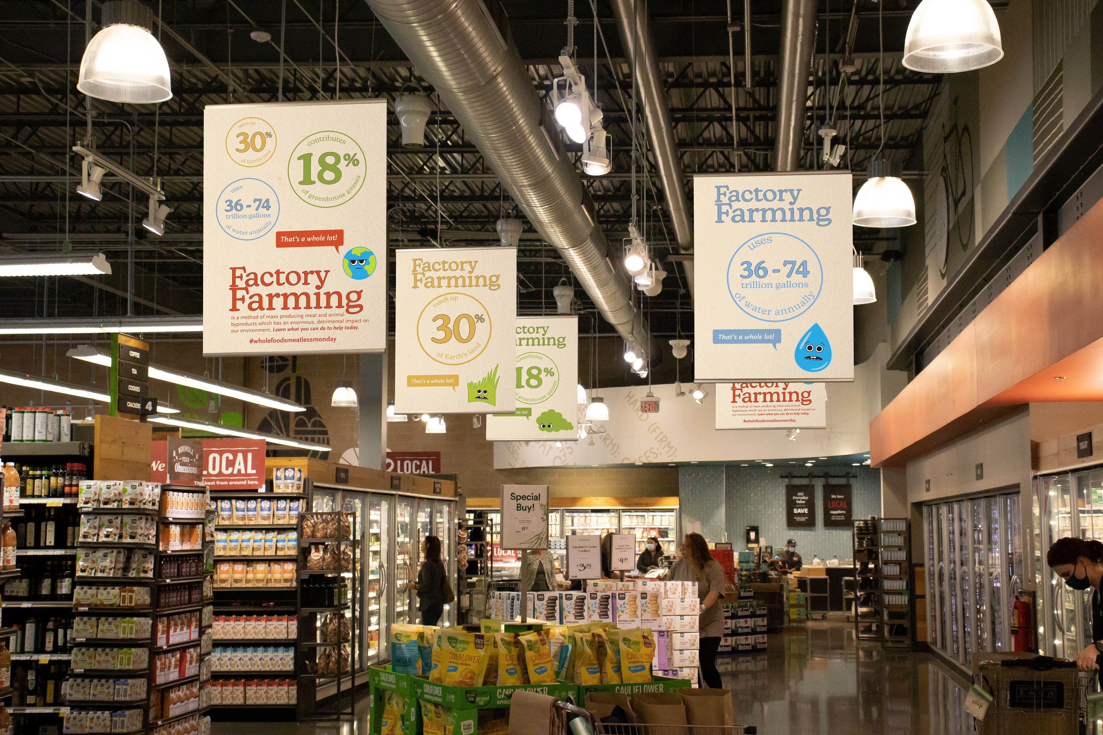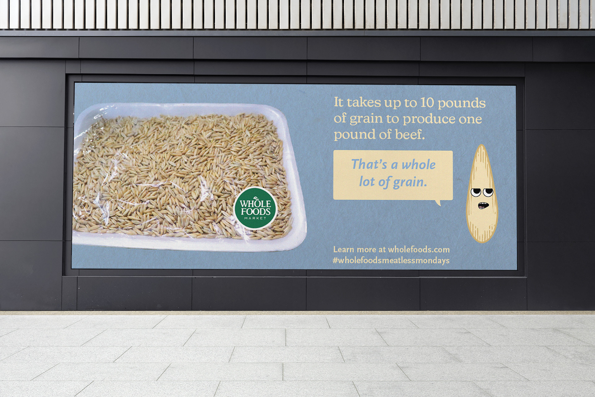 Factory Farming has a significant impact on the Earth’s resources, and one way we can combat the effects is to eat less meat. For this campaign, every Monday the popular grocer Whole Foods will take their meat products off the shelves to help reduce greenhouse emissions. This campaign not only gives an insight into the problems of factory farming but also gives people a way to contribute to decreasing the resources we use. Characters representing the impacts of factory farming were utilized in order to address the audience in a non-threatening manner.